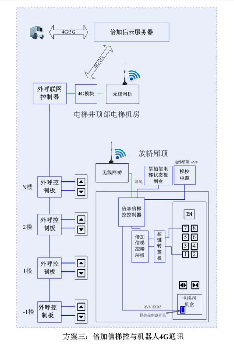 (1)機器人在電梯外,通個Wifi、藍牙、LoRa、Zigbee、2.4G、433M、語音或4G網(wǎng)絡等發(fā)送指令倍加信梯控系統(tǒng),系統(tǒng)自動點亮上樓或下樓按鍵,實現(xiàn)呼梯功能。