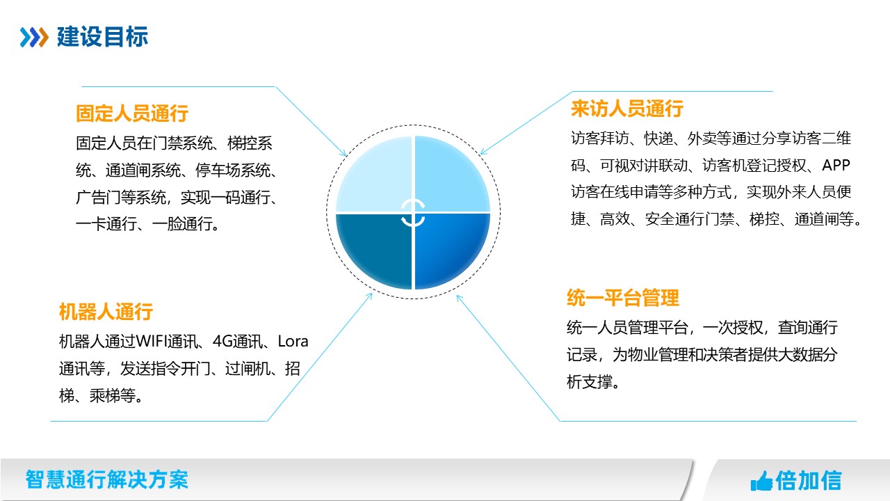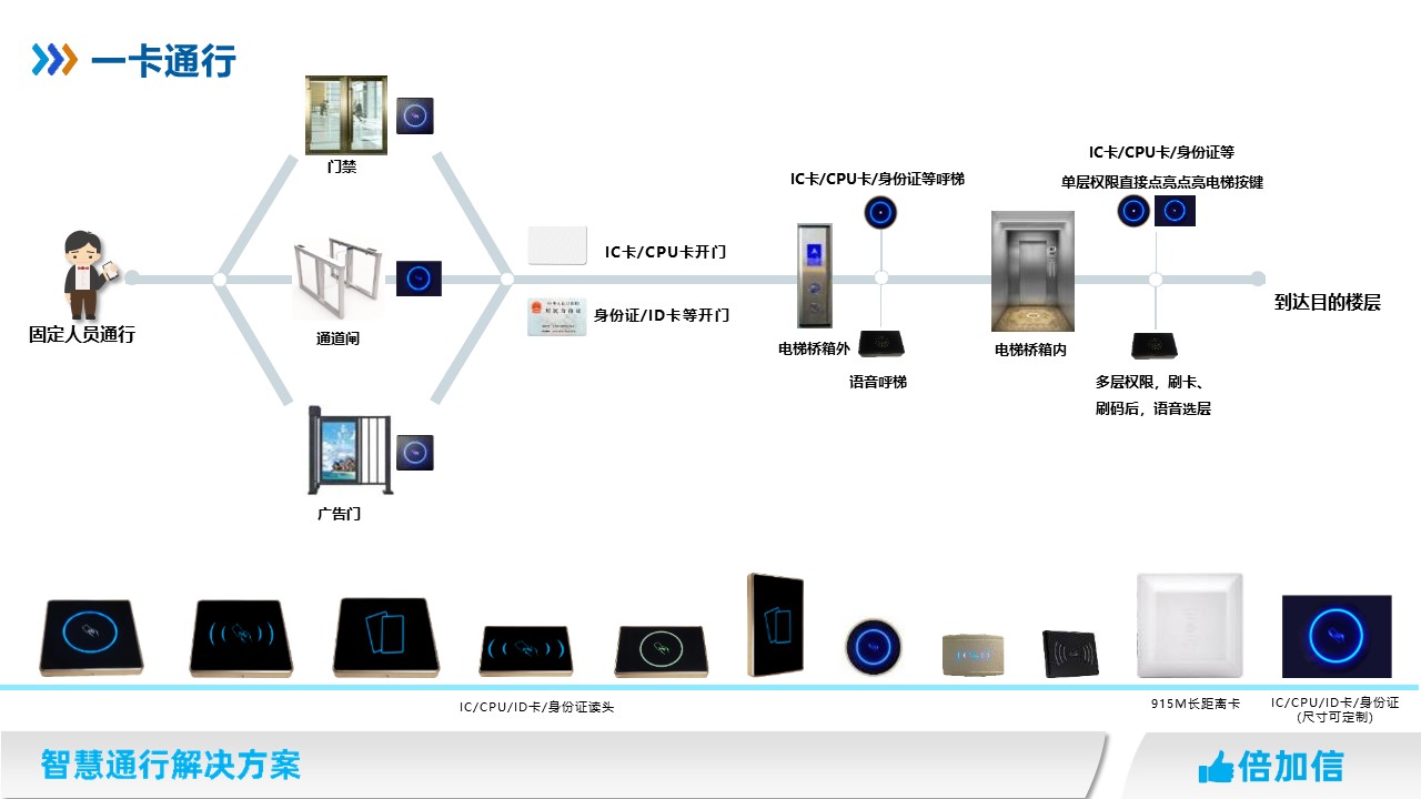 固定人員在門禁系統(tǒng)、梯控系統(tǒng)、通道閘系統(tǒng)、停車場系統(tǒng)、廣告門等系統(tǒng),實現(xiàn)一碼通行、一卡通行、一臉通行。