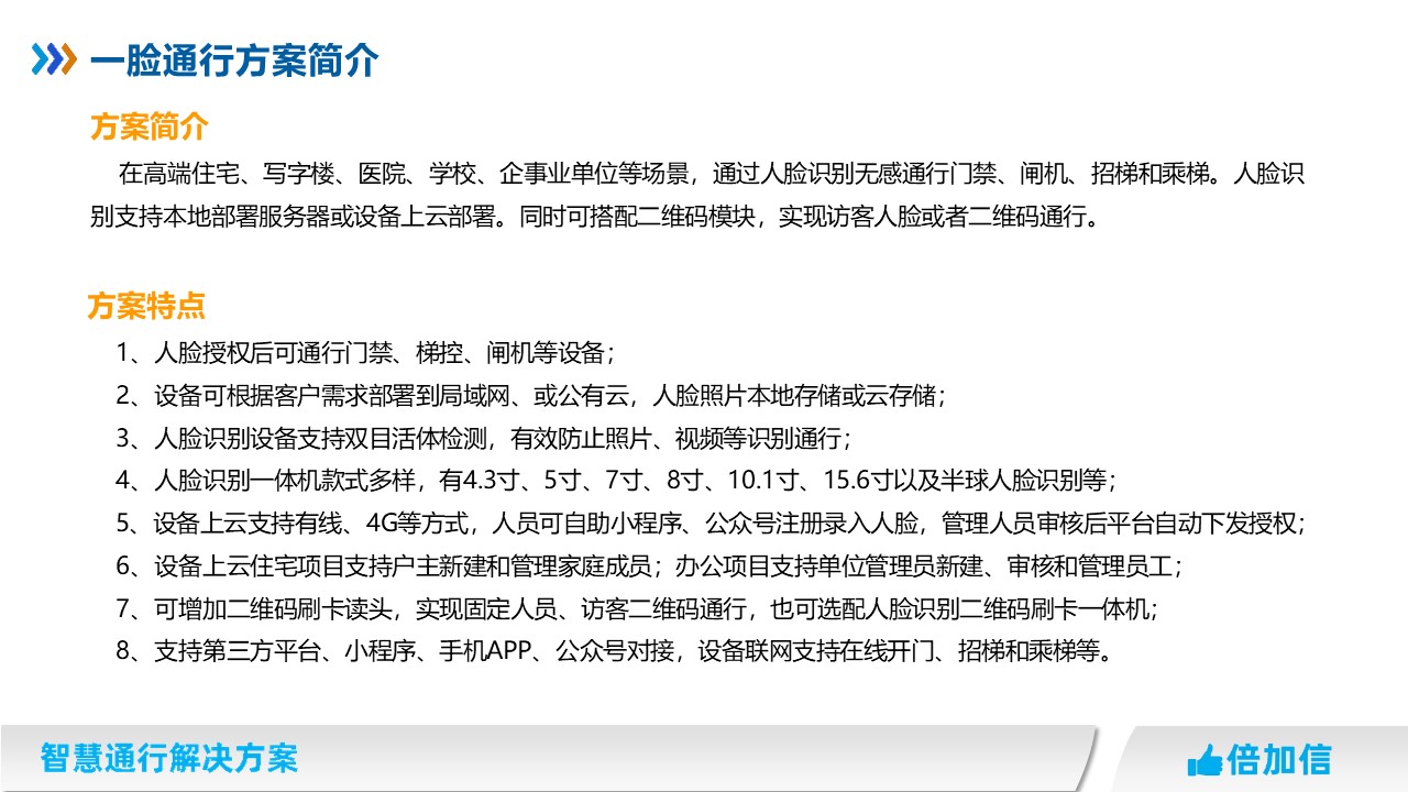 在高端住宅、寫字樓、醫(yī)院、學(xué)校、企事業(yè)單位等場景,通過人臉識別無感通行門禁、閘機、招梯和乘梯。人臉識別支持本地部署服務(wù)器或設(shè)備上云部署。同時可搭配二維碼模塊,實現(xiàn)訪客人臉或者二維碼通行。