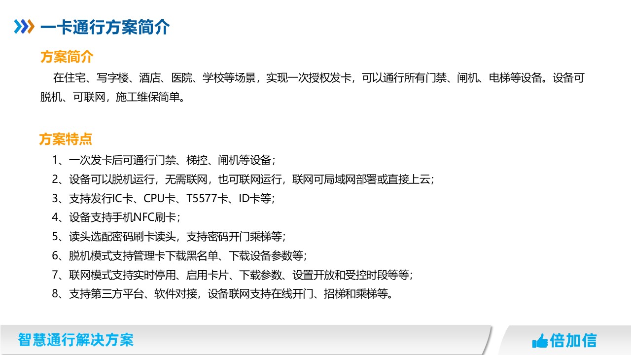 在住宅、寫字樓、酒店、醫(yī)院、學(xué)校等場景,實現(xiàn)一次授權(quán)發(fā)卡,可以通行所有門禁、閘機、電梯等設(shè)備。設(shè)備可脫機、可聯(lián)網(wǎng),施工維保簡單。