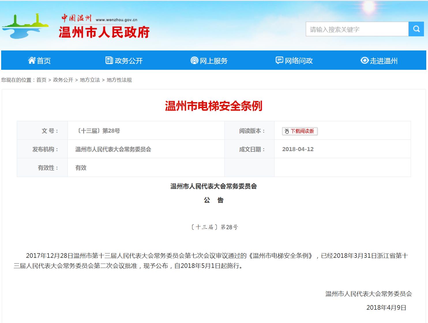 2017年12月28日溫州市第十三屆人民代表大會常務委員會第七次會議審議通過的《溫州市電梯安全條例》,已經2018年3月31日浙江省第十三屆人民代表大會常務委員會第二次會議批準,現(xiàn)予公布,自2018年5月1日起施行。
