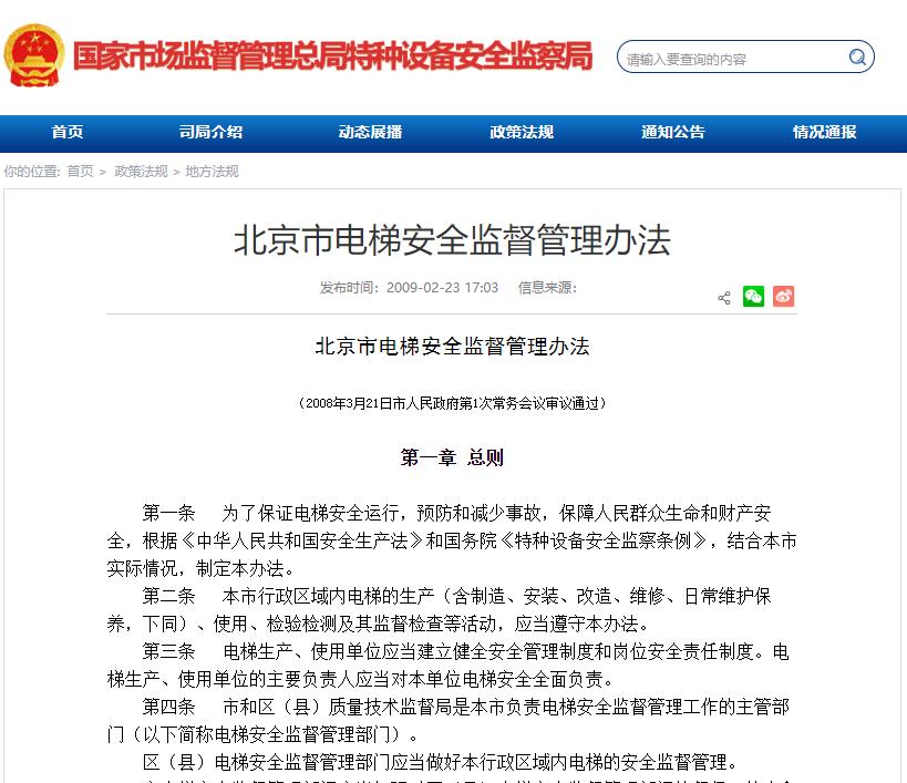 第四十六條 本辦法自2008年6月1日起施行。2003年6月10日市人民政府發(fā)布的《北京市電梯安全監(jiān)察辦法》同時廢止。